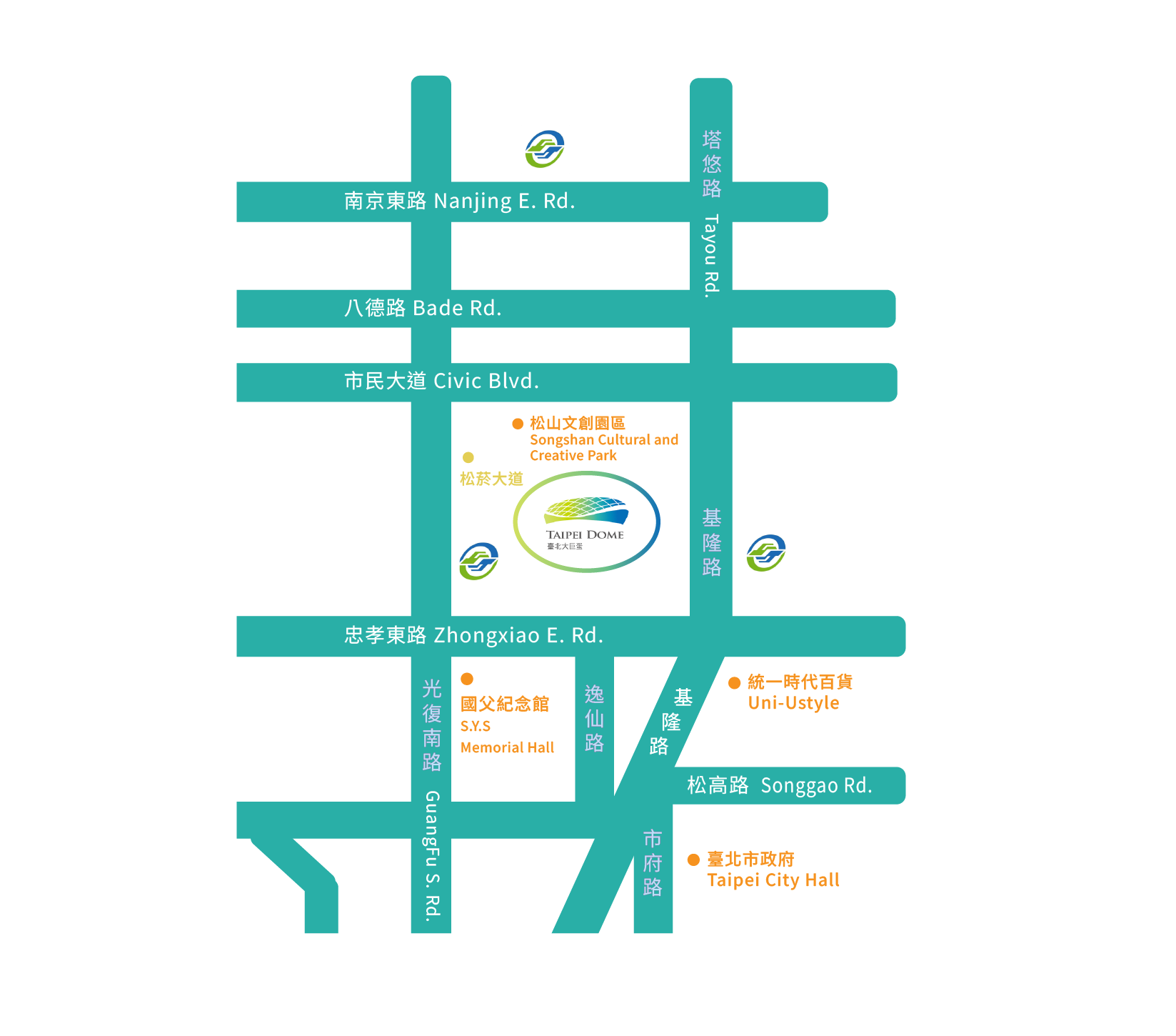 園區位置為捷運藍線國父紀念館站及市政府站之服務範圍,其中園區西南側為國父紀念館站4號及5號出入口,藉由捷運轉乘及公車接駁,可輕鬆連結捷運文湖線、淡水信義線、中和新蘆線、機場捷運線等。