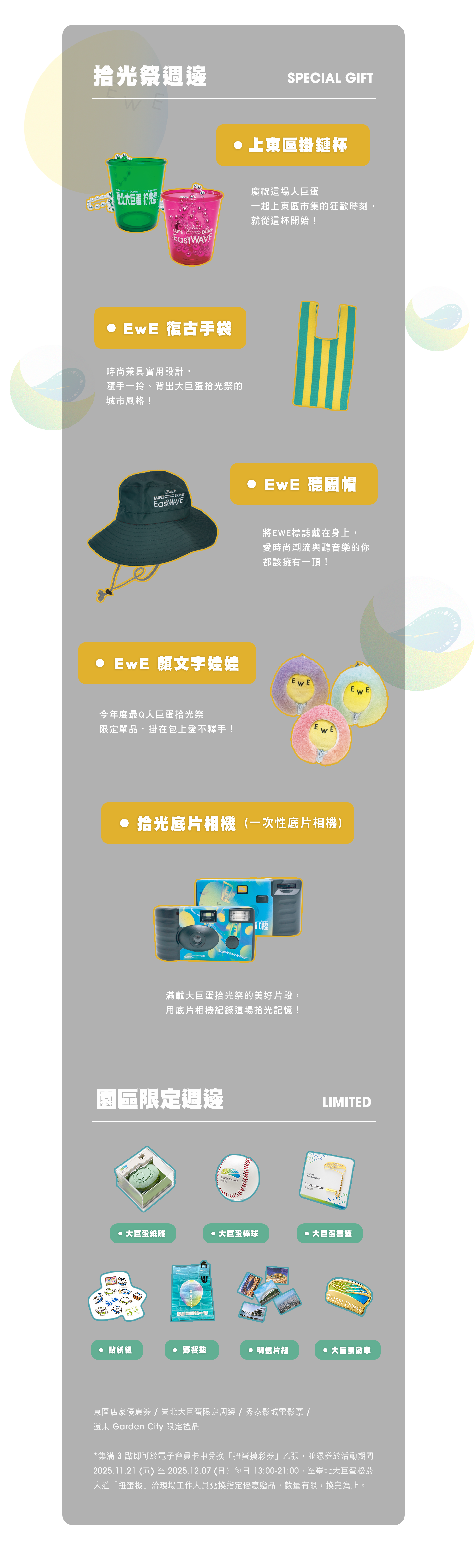 *注意事項說明:扭蛋優惠券於 2025.11.21 (五) 13:00 至 2025.12.07 (日)21:00 至臺北大巨蛋松菸大道「扭蛋機」洽現場工作人員兌換指定優惠贈品,數量有限,換完為止。